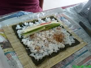 spread the rice out over the nari (seaweed) with cucumber, crab stick, mayo, garnishing..